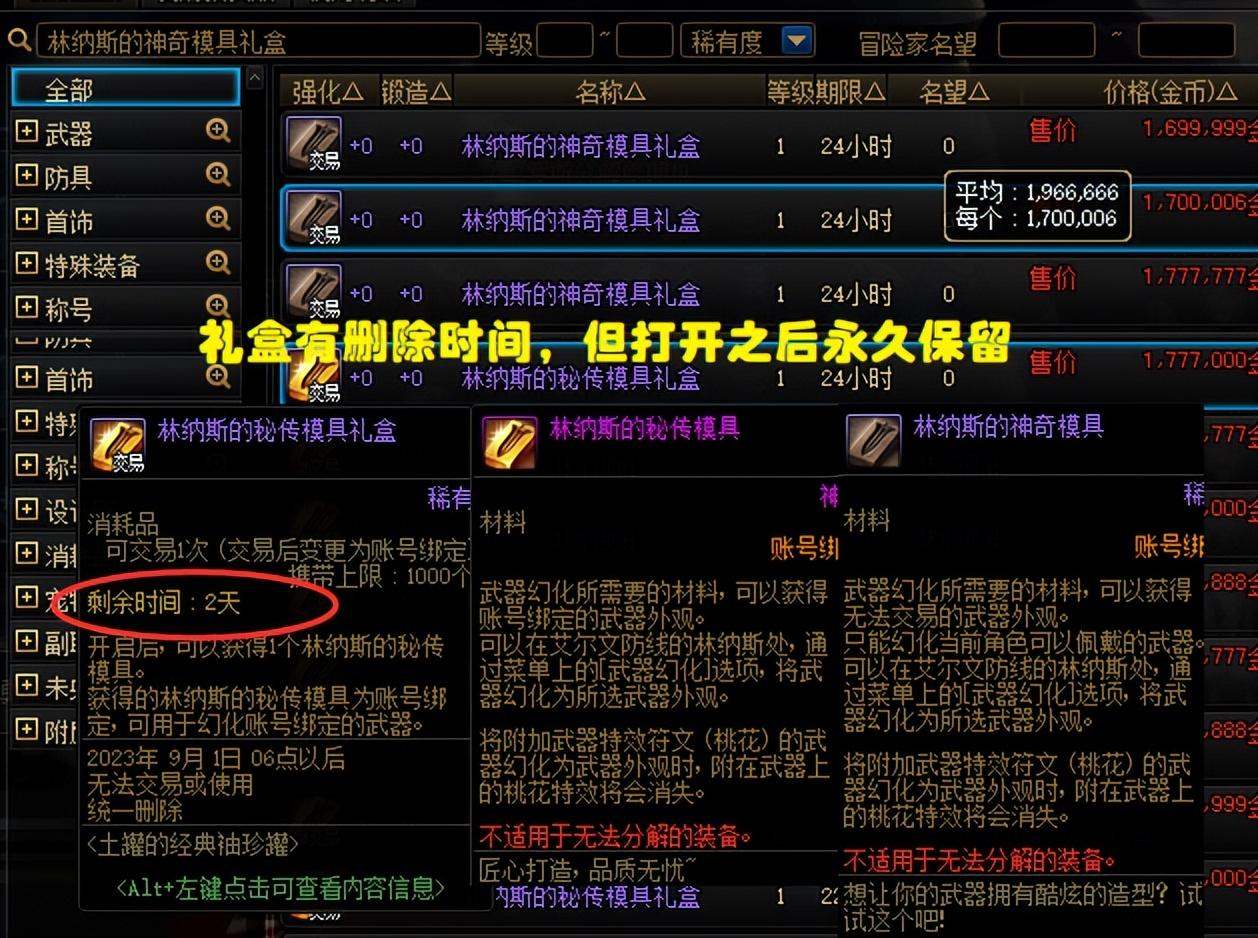 【2、武器幻化】,林纳斯的神奇模具(无法交易)售价170万,林纳斯的秘传模具(账号绑定)175万。