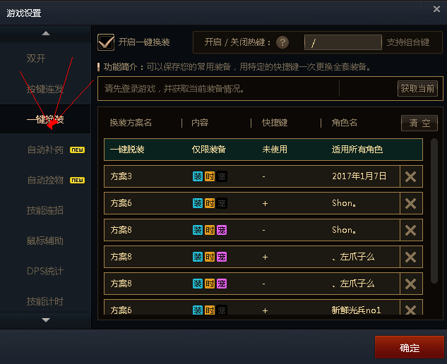 温馨提示,如图,每个角色设置两个快捷键,一个正装,一个换装,可以重复设置的,而且一次设置,换电脑也可以用。
