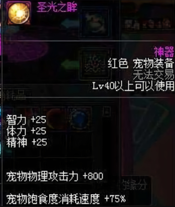 宠物装备我们都知道,毕业的宠物装备基本都是春节套的产物了,但是一套才给一个,一个宠物有三个宠物装备,所以要买三套,着实也是有点压力的。不过可能很多小伙伴都不知道,除了白图中爆的一些垃圾宠物装备,在一个地方,也会爆一些媲美春节宠物装备的东西,甚至超越春节宠物装备,那就是极限祭坛。现在的宠物装备基本都是为C量身打造的,但是在极限祭坛中,有一个名为圣光之眸的宠物装备,是为奶爸奶妈量身打造的。四维除了力量,都增加25点,有了这件装备,你才是一个能登上巅峰的奶。