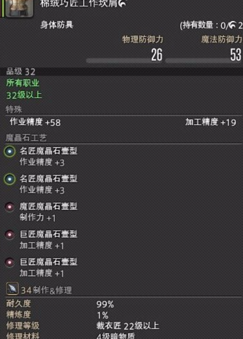 之后,用同样的方法做50个HQ的2星料理,可以换70级主手,但这个是各个职业分开的,厨子的话大约18万,其他职业,没个几百万的话还是放弃吧~70级的主手和眼镜,因为不是制作出来的装备,所以不能打晶石。
