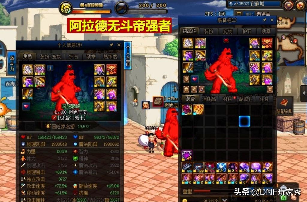 旭旭宝宝以“钞能力”,解锁阿拉德斗帝成就,成为了第一位斗帝玩家,让人叹服,也让他的身份,从“旭弟”转变为“旭帝”。但是,我们普通玩家不要效仿,旭旭宝宝全身装备高增幅,1件18、2件16、9件17,各种细节完美,氪金破亿才达成,普通玩家能够达成1.6万就可以遨游阿拉德了,没必要花冤枉钱。