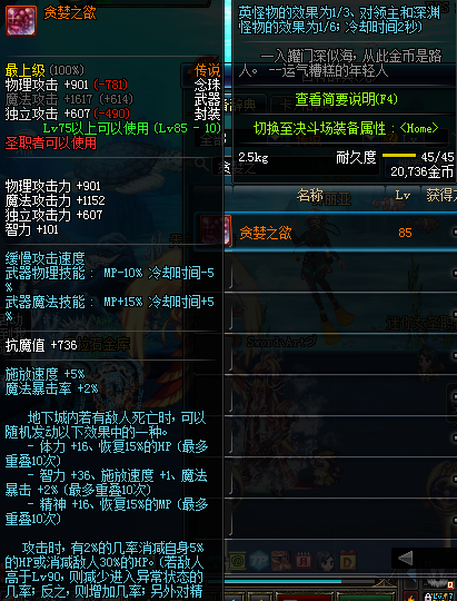 85级的传说念珠武器,可以从拍卖行中直接购买。除了削血效果外,每当有一个敌人死亡的时候,可以发动三项随机的属性,其中智力+36这一项最高可以叠加10次,简直就是白图利器。