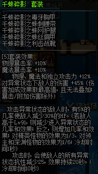 85级的重甲史诗套装,只有凑齐5件千蛛才能触发套装的削血效果。这套装备在90版本依旧是很不错的,有固定的减防,12%三攻的提升,45%的黄字伤害和削血,可惜就是需要套装才能享受这些效果,所以难度系数非常之大。