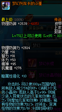 85级传说皮甲上衣,所有职业都可以穿戴,而且拍卖行中的售价大概是300w只有一件。这件装备价格低廉比较亲民,还有较高的四维,可以弥补非本职业装备类型精通带来的缺陷,除此之外还带有10点的暗属性强化。