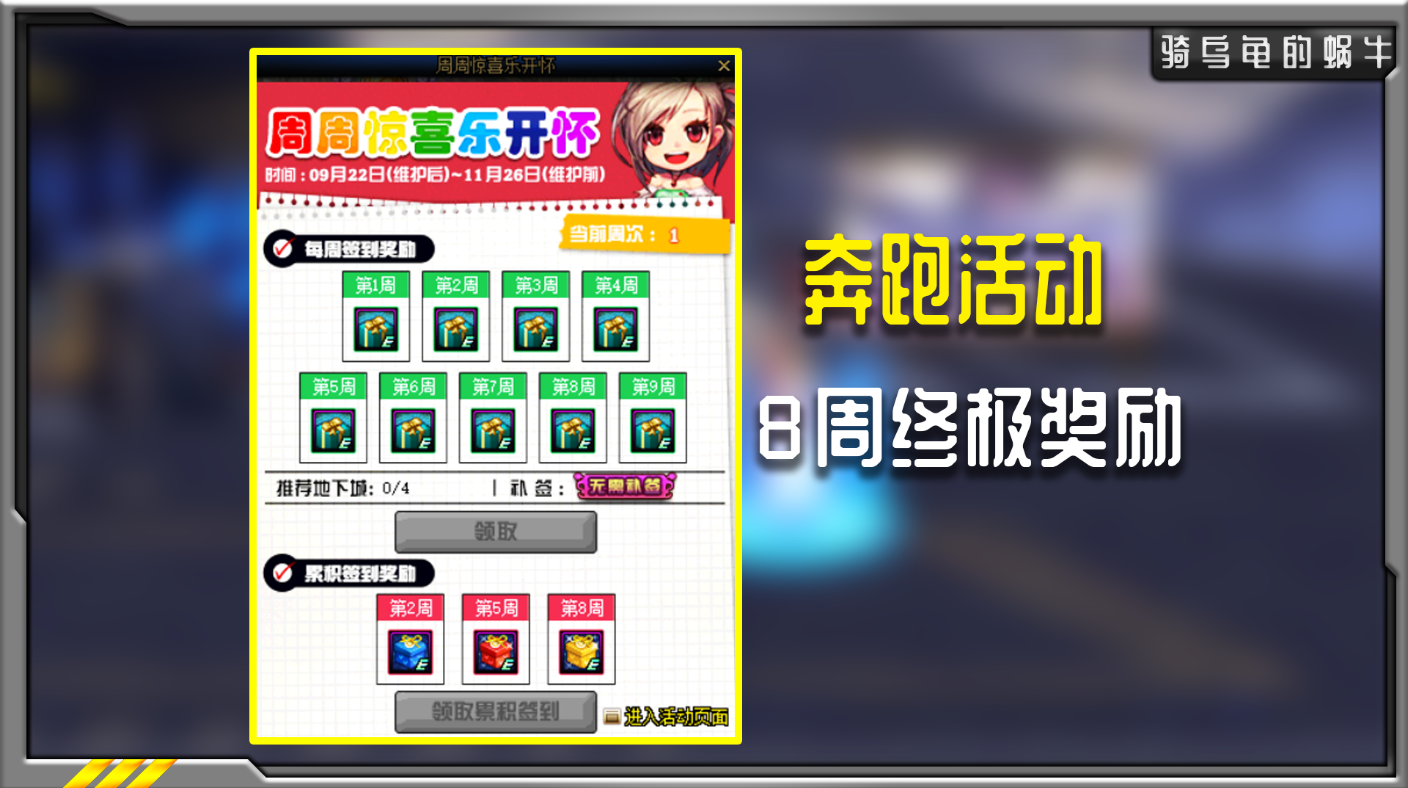 奔跑活动,本次的持续时间是9周,终极奖励是累计8周签到获得,每周通关4次推荐地下城即可参与。