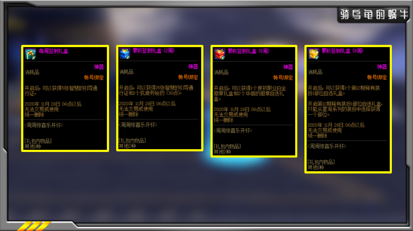 每周签到最近的好几期奔跑都是统一的奖励,这一次依旧是5张智慧的引导通行证礼盒,个人觉得没有以往的奔跑每周不同奖励更有吸引力了。累计2周签到依旧是通行证礼盒,但是是15张加上30点疲劳药;五周签到给的是大职业自选的随机白金徽章和2个华丽自选徽章,因为毕业概率不高,吸引力不大,当然不排除有狗拖级别的玩家一发毕业入魂,比如说我自己。终极奖励8周给的是1个第12期的天空自选礼盒,不过因为2个月才能拿到,吸引力自然不高了。
