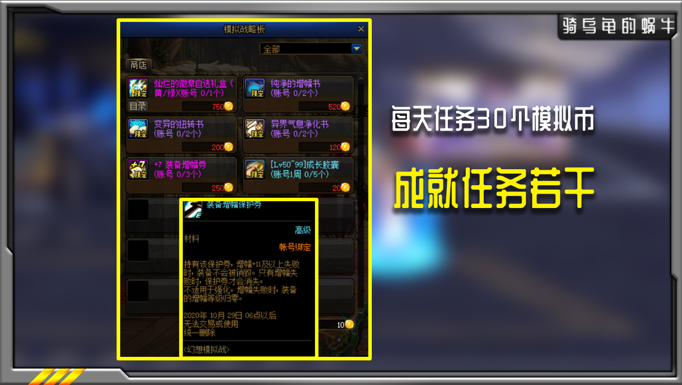 活动奖励个人觉得还不错,完成所有成就任务还能获得一张增幅保护券,而模拟币可以在商店兑换到灿烂徽章自选礼盒,也就是活动限定的15黄色力量系列徽章,2本纯净的增幅书,3张+7的增幅券,2本扭转书和净化书,这些对于普通玩家来说简直是免费打造红字的关键,而灿烂黄力徽章也是毕业党提升细节的关键。