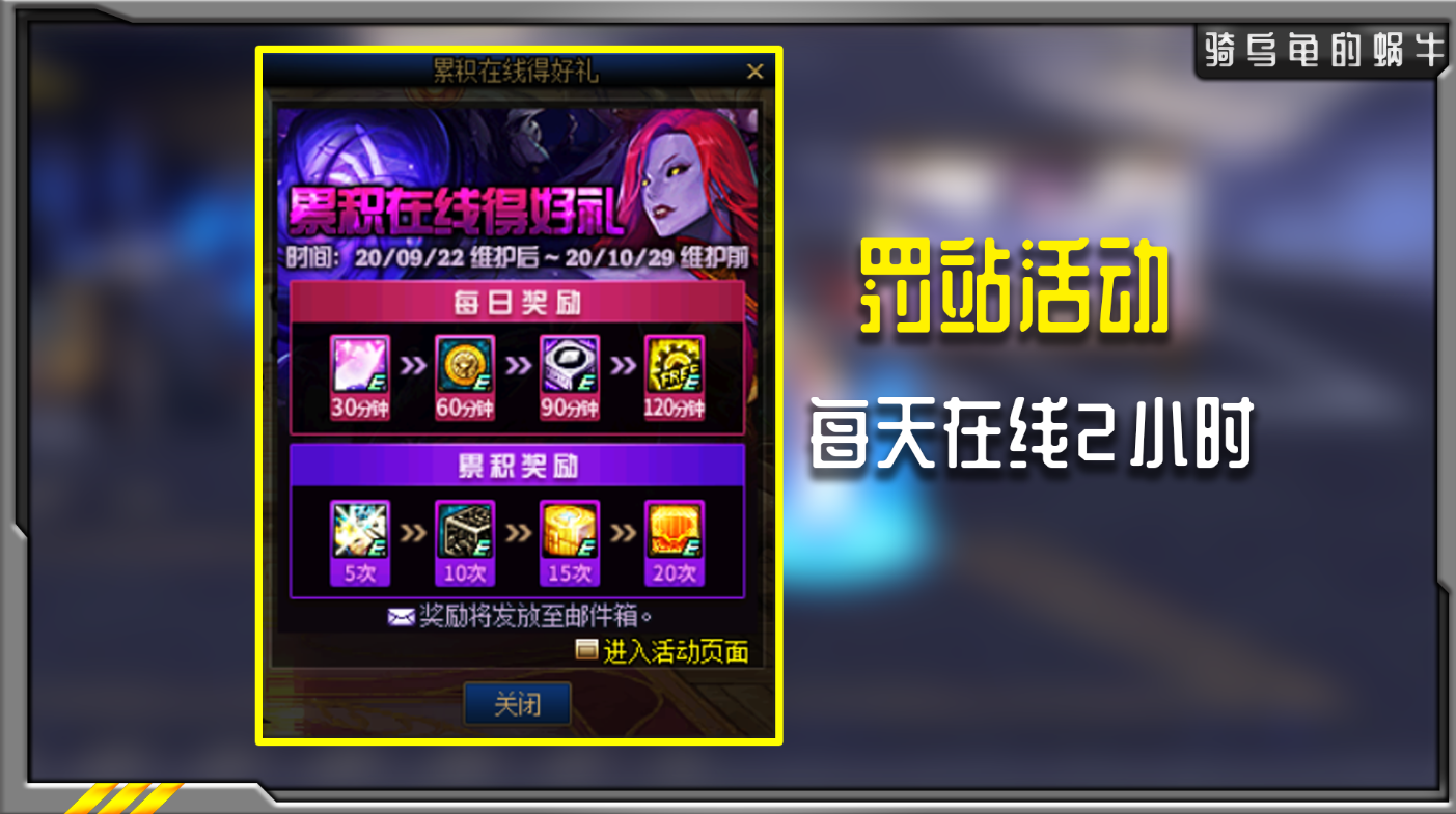 经典的罚站活动,累计20天可以拿到终极奖励,持续期间每天2个小时在线可以获得每日奖励。