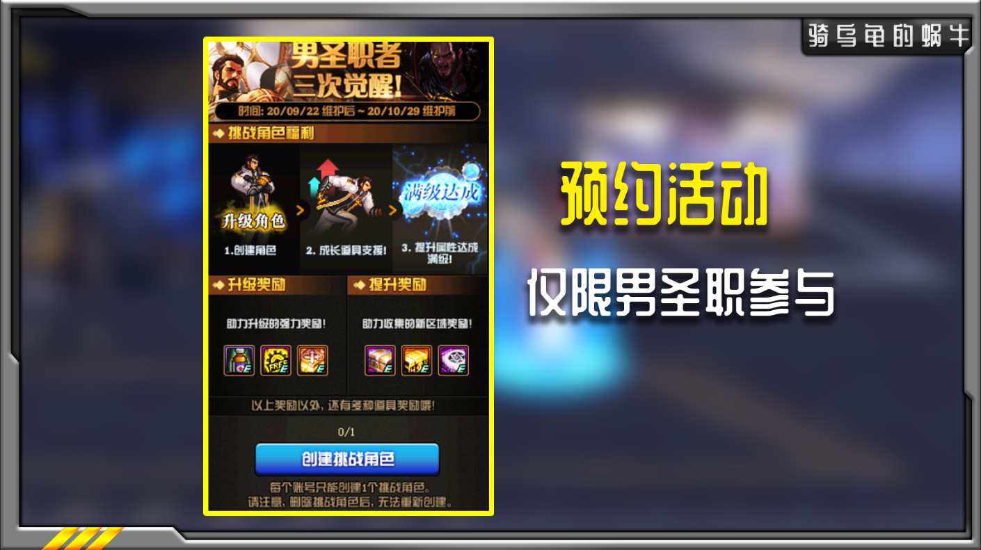 男圣职的三次觉醒活动,不过这一次只能是男圣职预约,并且可以选择满级的男圣职参与,满级的奖励有本职业的神秘护石和毕业换装武器,但是满级挑战奖励仅有神器装备和传说装备,并没有之前的预约活动奖励丰富,建议满级角色参与。