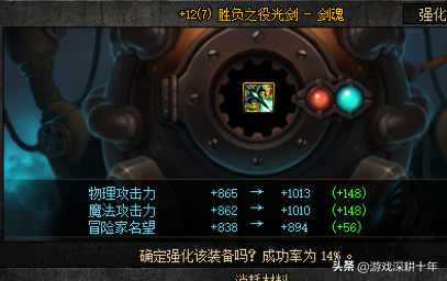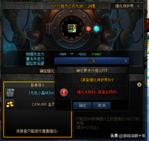 但是武器在强化13的时候,强化失败装备会碎,如果装备碎了会损失装备词条等级