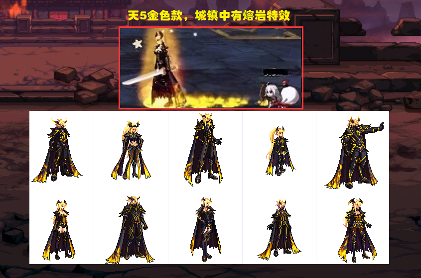 注意看,这可不是普通的“天5”,而是“金色款”,也就是传说中的隐藏配色,主要有2个特殊点:一是穿戴天5套装走在城镇中,有熔岩特效,金色款的特效也是金色的;