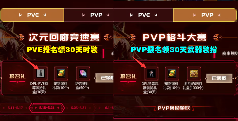 【2、免费燃武套】点击参与下方的“次元回廊竞速赛”,PVE模式下报名礼为“30天燃武时装”,PVP模式下报名礼为“30天燃武装扮”。