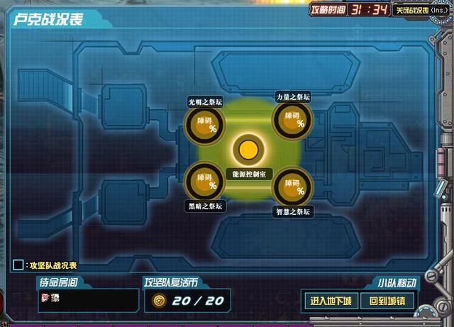 通关后会出现光明之祭坛——力量之祭坛、黑暗之祭坛——智慧之祭坛,和一个单独的能源控制室,首先说一下这个能源控制室,能源控制室就如同安图恩的感染一样,不压的话祭坛里的怪回血会非常快并且副本中的角色会受到减益BUFF,需要分配一个队伍去把能源打掉。