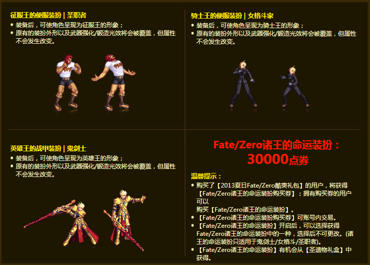 早在2013年的时候就推出了第一款《Fate zero》联动礼包,其中顶级道具正是3款皮肤,人气较高的则是男鬼剑的金闪闪皮肤。