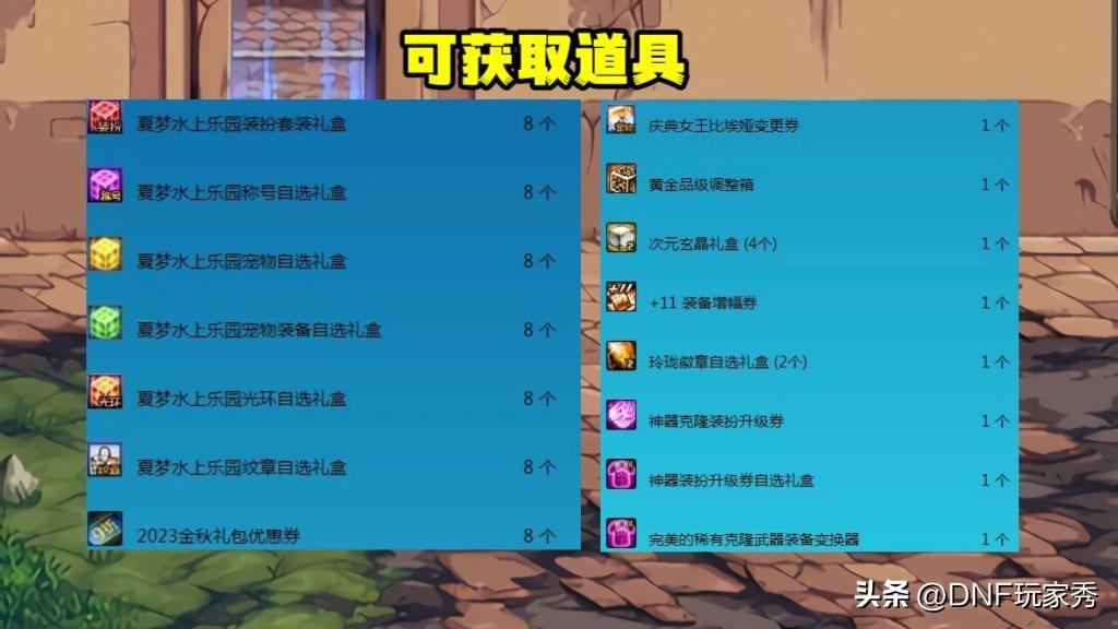 【夏日套装*8、夏日称号*8、夏日宠物*8、夏日宠物装备*8、夏日光环*8、夏日纹章*8、金秋9折券*8、金秋宠物变更券*1、黄金品级箱*1、次元玄晶*4、11增幅券、玲珑徽章自选*2、透明神器装扮升级券*1、神器装扮升级券自选*1、稀有克隆武器变换券*1】