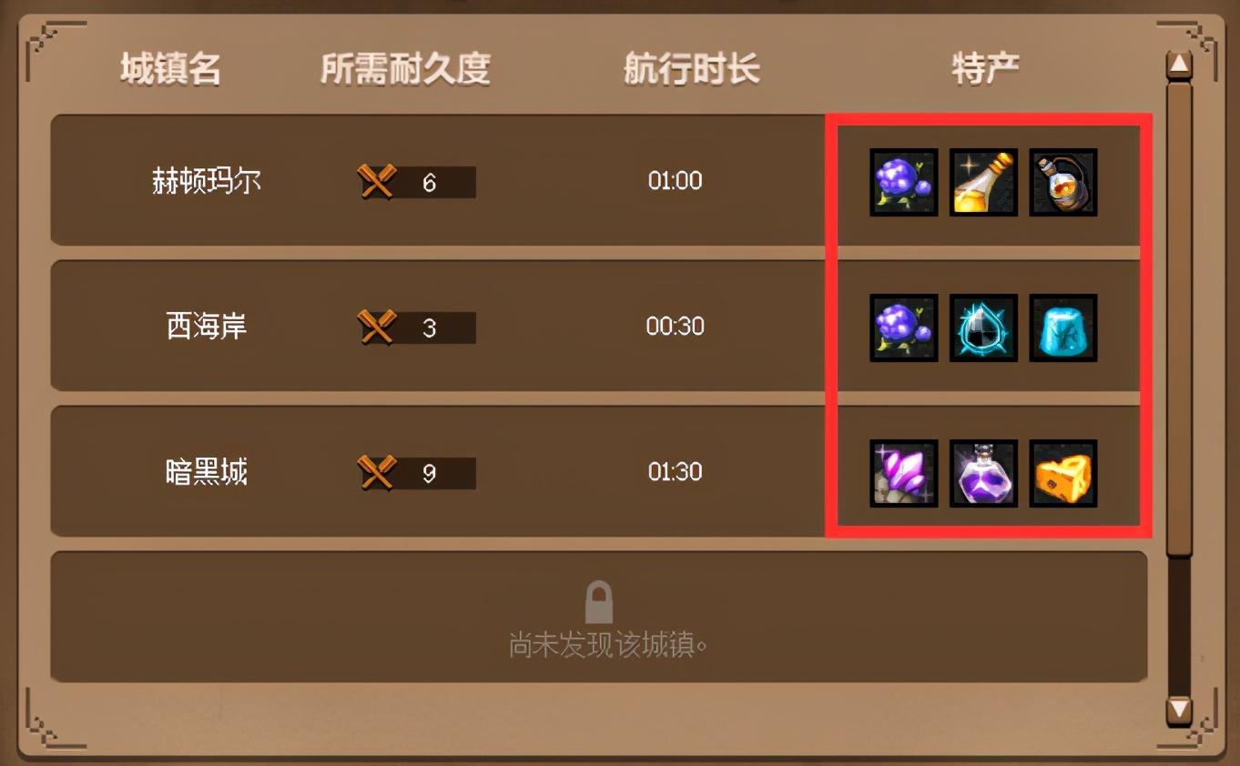每个城镇中均有三种特产,其中,第三种特产需要我们完成一定的游戏内容才能解锁,因此需要勇士们慢慢探索。
