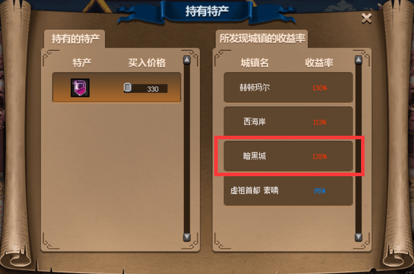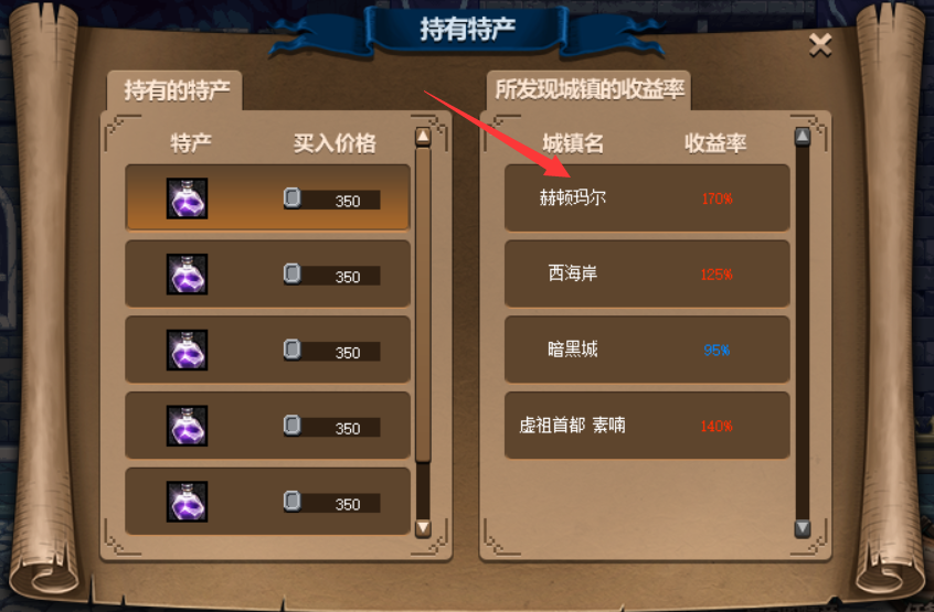 此外,当我们购买特产后,也可在页面右下角的“持有的特产”中,点击自己已有的特产,查看其不同城镇的收益率。在条件允许的情况下,我们要尽可能地将特产带到高收益率的城镇进行出售。