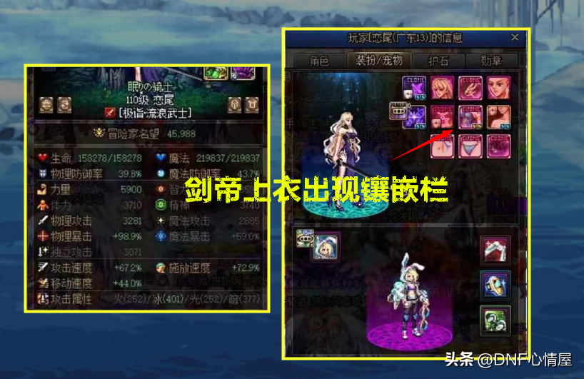 关键这位剑帝,装备和装扮上,都有镶嵌徽章,这就过分了!好在只是上衣部位,开了镶嵌孔,其他并没有,否则事情就大条了。由于只是一件装备出现镶嵌孔位,不是那么的起眼,加上大部分玩家,不太注意装扮栏,发现的比较晚。