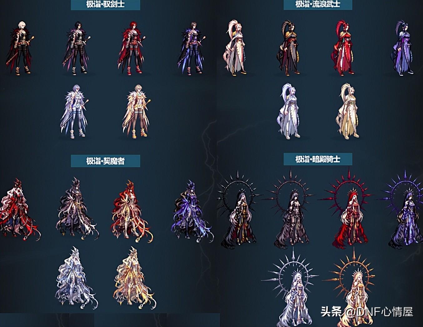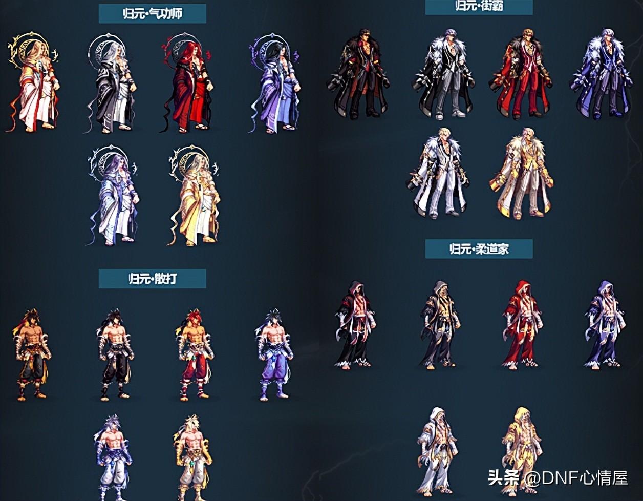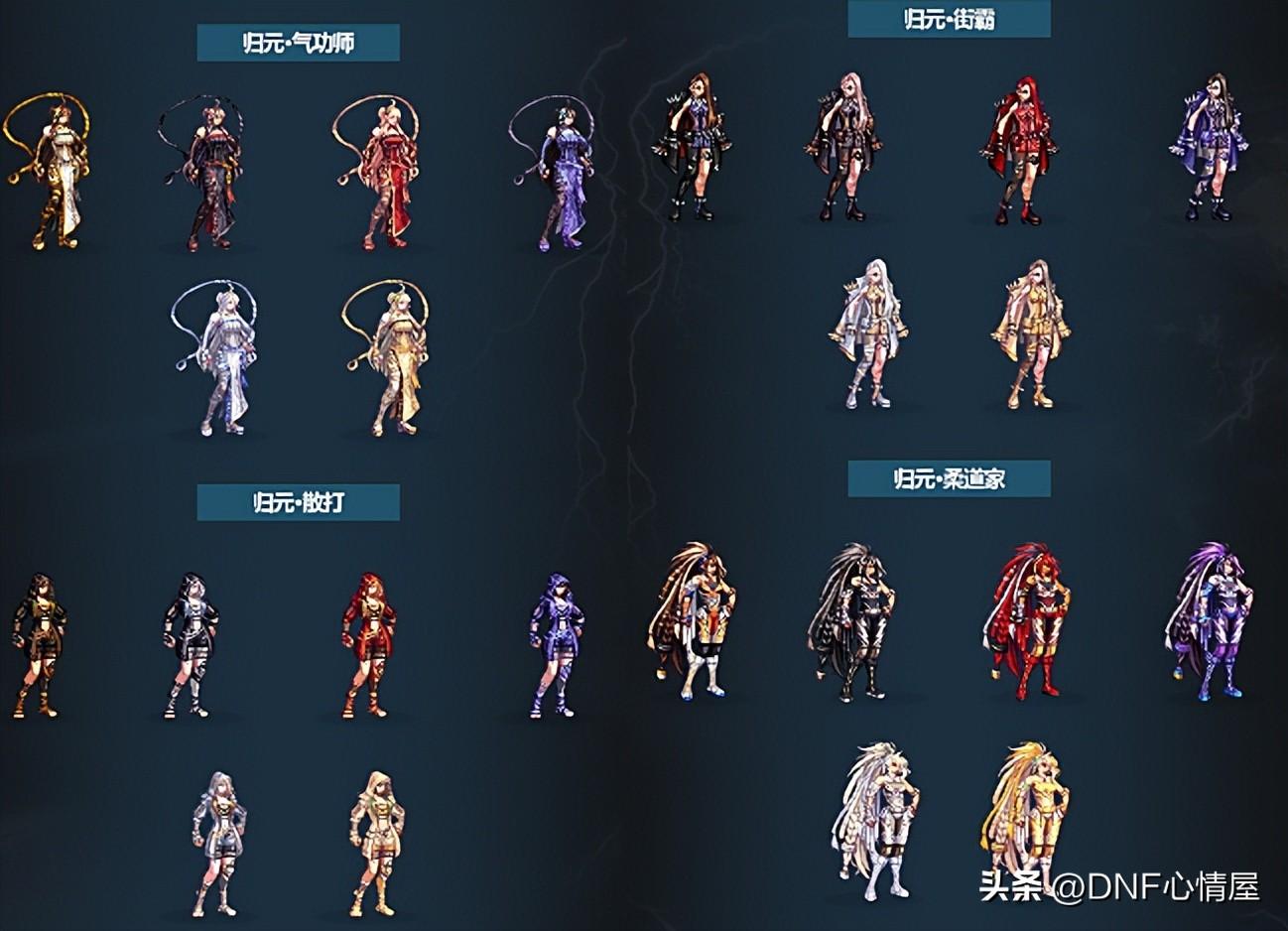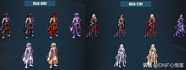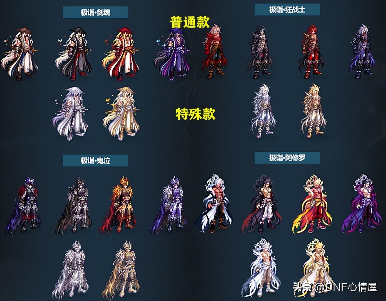 1、鬼剑士三觉装扮。 鬼剑士系列职业,一共包含10个角色,每个都有特定的三觉外观,除了4款普通的外,还有2款特殊类型。