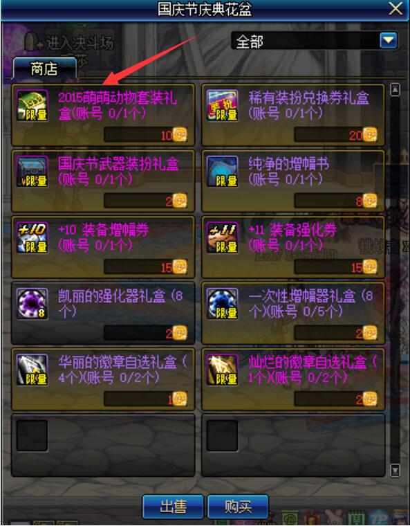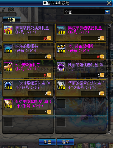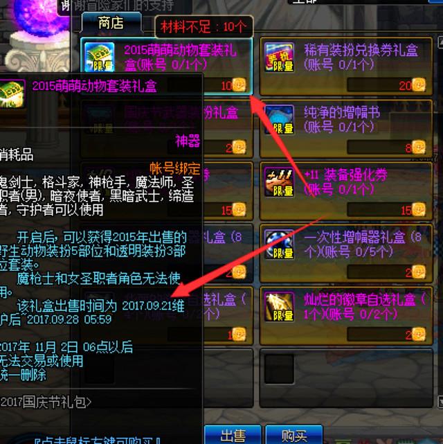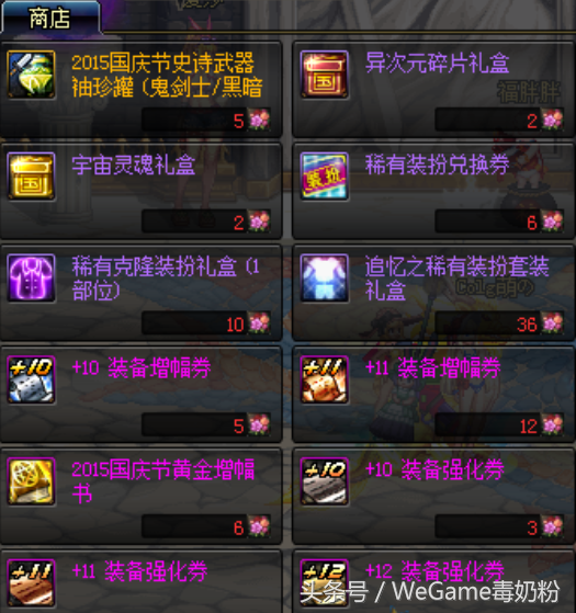 首先取消追忆天空,加入2套节日套:动物园和哥特,买一套国庆送8个材料,这时候随着DNF回暖,物价开始暴涨,策划也赶上潮流国庆花篮也涨价了,+10增幅券=15个,差不多2套国庆了,15年和16年仅需要一套就行,甚至还只供应一张,+11、+12增幅全都没有,一件天空兑换券=20个,需要2.5套国庆,比前两天翻了一倍,这些就算了,就连一次性增幅起都加入国庆花篮了,最搞笑的是账号上限5个,就怕玩家们喜欢兑换。