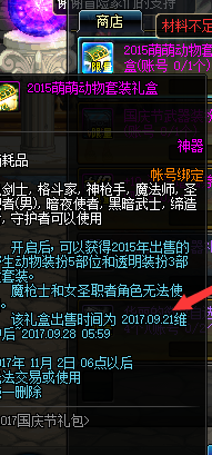 可以看到增加了一个新的兑换内容,那就是2015年动物套装扮礼盒;并且售卖时间为大版本更新后的第一周;