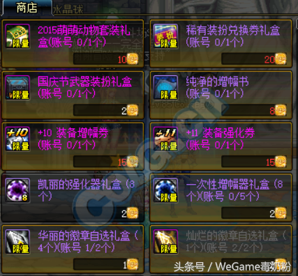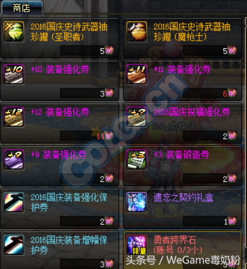 16年同样是一套国庆送5个材料,而且大部分奖励都一样,不过追忆天空从36个变为35个刚好7套就行,并且有账号上限一套的限制,可兑换2~5期的稀有装扮,并且加入了史诗跨界石=21个,白金徽章自选礼盒=5个,账号上限一个,+12装备增幅=20个需要4套国庆,现在+12钻石卷子都是2000块左右了 ,当时4套就送并且没有上限,果然国服游戏最强的就是策划的补丁。