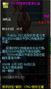 仅有338套装的礼包中赠送大量的材料和克隆装扮,并且是每一个礼包中都有梦幻克隆装扮,装扮的属性是国庆套的属性,因为国庆套真的非常丑,所以我们可以选择带克隆装扮,然后分解掉国庆装扮。最后,克隆装扮是不可交易的,所以别想一个礼包两个号用啦。梦幻克隆装扮可以与今年国庆套组成套装。多余的分解就好
