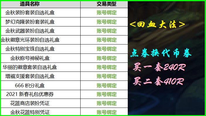 一套国庆礼包的大概售价为33800点券,那我们通过转手代币券的方法,就只需要准备260R购买金币,然后换取代币券,基本上就可以入手一套了。