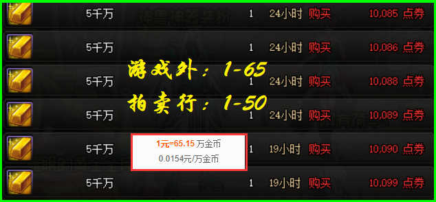 总的来说呢,“回血”的关键其实在于,金币和代币券的比例高低! 就目前而言,100R入手6500金币是完全可以接受的,但是拍卖行出售金币的玩家实在太多了,反而导致金价疯狂下跌。