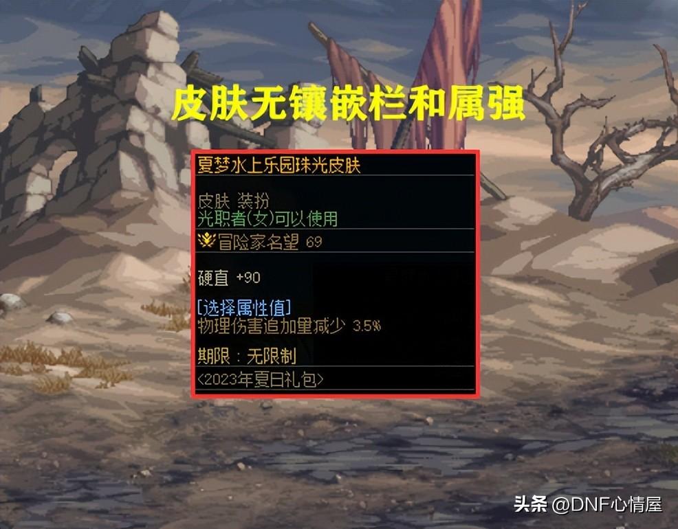 在积分商城中,可兑换“夏梦水上乐园皮肤装扮专用镶嵌栏开启装置”道具,简单来说,可以给皮肤打孔,但仍旧无属强!没属强有皮肤镶嵌栏,给缪斯“奶弓”使用,则是恰到好处。毕竟我们都清楚,缪斯作为辅助职业,并不需要属强。