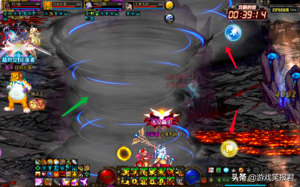 吞噬魔不吃属性球是无法击败的(处于不破防状态),此外,区别于85版本的安徒恩团本,再战安徒恩吞噬魔会释放飓风技能干扰玩家(图中绿颜色箭头所示),只要走位躲避即可。