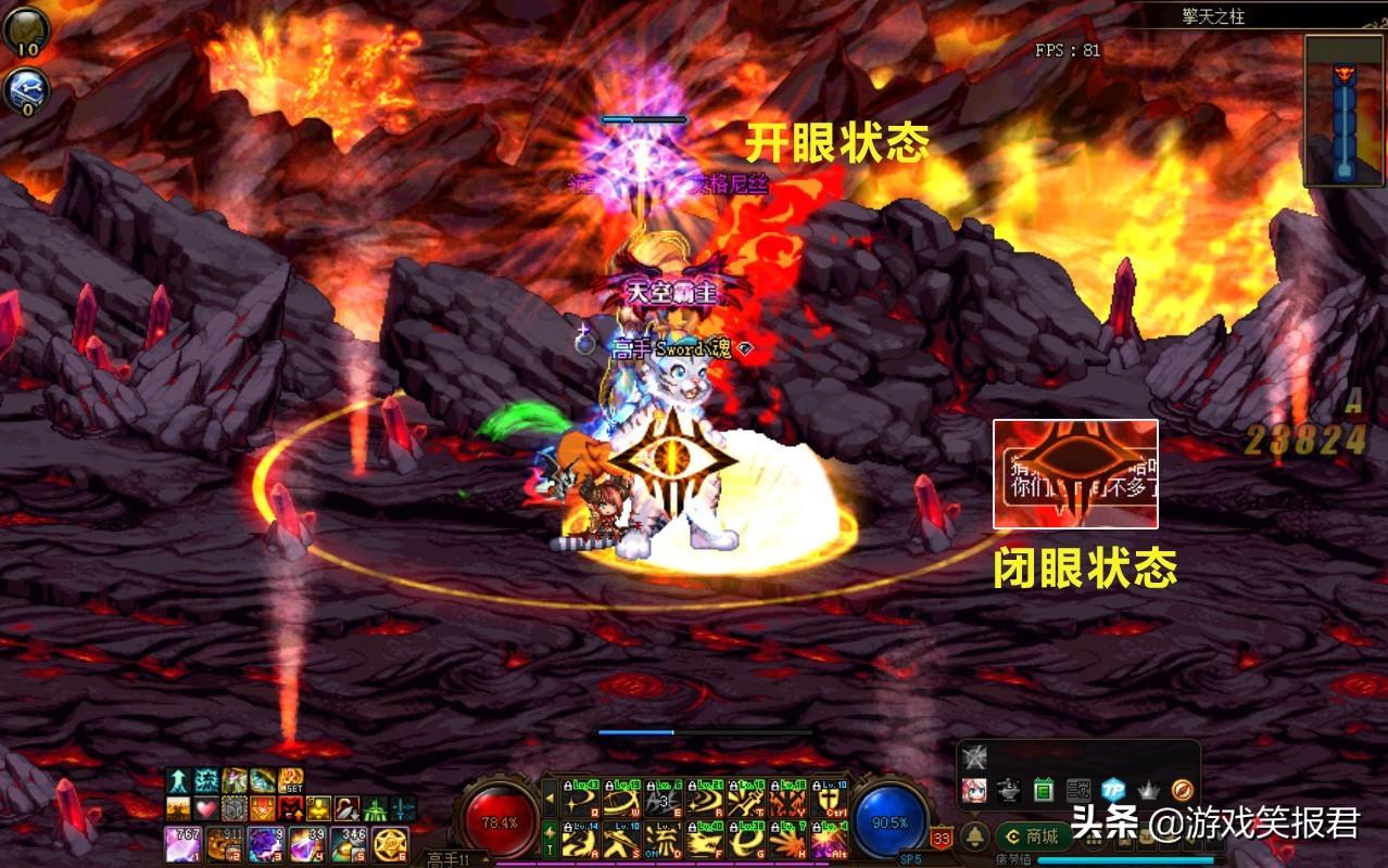 擎天副本boss艾格尼丝有两种状态,分别是开眼状态和闭眼状态,当boss处于开眼状态时,如果有玩家攻击boss,则伤害会反弹到全队队员身上,这个时候乱打一通的队员一定会被吐槽的。所以什么时候可以攻击boss很重要,当boss出现图中闭眼状态,且无防护罩的情况,则可以进行攻击。