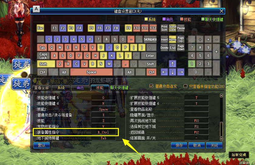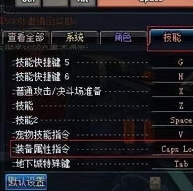 3、玩家打开游戏的键位设置界面,在技能栏中可以找到装备属性指令,就可以选择一个自己喜欢使用的键位替换上去。