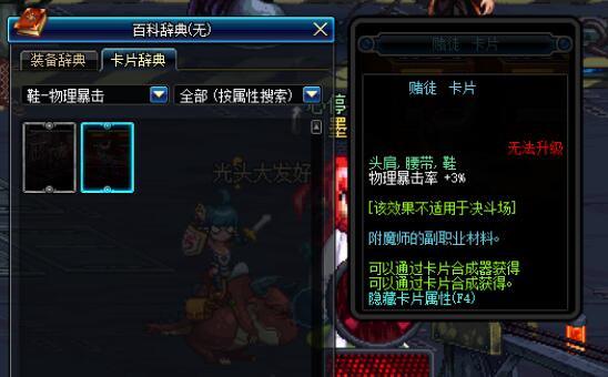 就剩下上下衣了,建议选择魔剑士的卡片,增加力量的同时,还增加独立,非常棒的属性,如果不是价格太贵的话,我一定会给的红眼入手的。