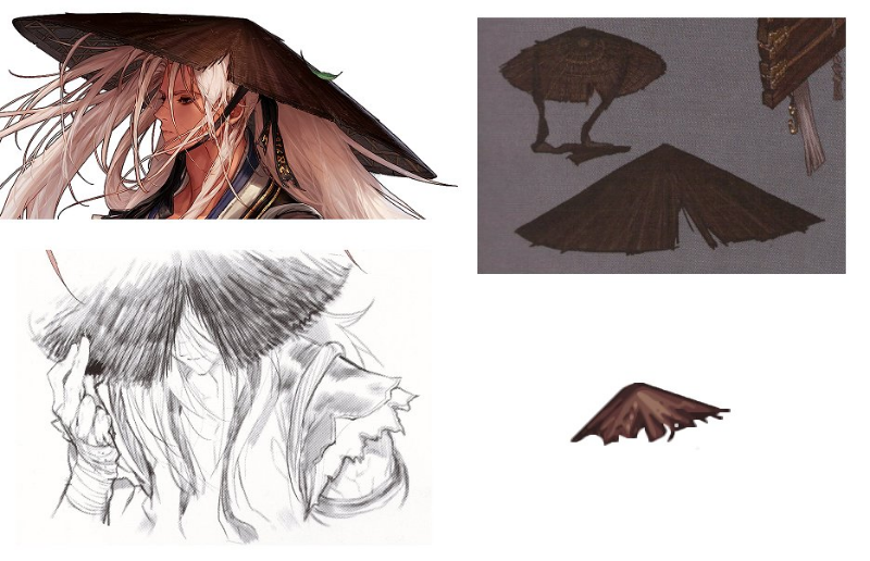 ◆三觉风格体现的是一种超脱人间的境界,一顶草帽,一身布衣,一根鱼竿,一根树枝……,像极了武侠小说中的世外高人,立绘中所体现的细节,也是最多的(严重怀疑美工总监是玩剑魂的):- 斗笠细节很棒,点阵图做上了残缺效果,设定集中也多处展示,包括手绘【特篇】证实了剑魂会笑:
