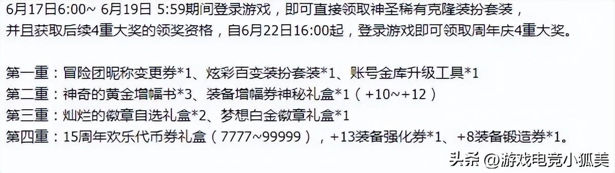 第一弹:冒险团昵称变更券*1,之前策划就爆料过了、炫彩百变装扮套装*1,一周7天每天一个外观,都是之前的活动时装,其实之前就出过了,不过是期限道具,这一次不知道是不是永久、账号金库升级工具*1第二弹:神奇的黄金增幅书*3、装备增幅券神秘礼盒*1(+10~+12),增幅一下耳环还是不错的。