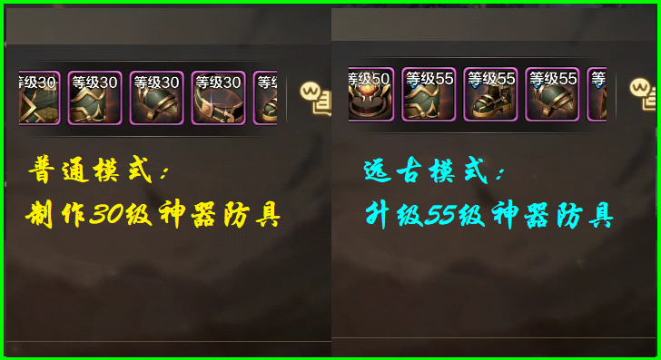 【王的遗迹】 :手游中王的遗迹分为“普通”和“真远古”两种模式,分别对应了30级和55级的神器防具,当然了,两套装备是不会冲突的,可以直接用30级神器加上材料,就能升级为55级神器了。