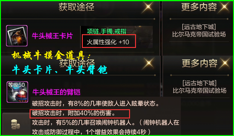 【机械牛】 :作为50级高端副本,可以爆出机械牛卡片(+10火强),50级散搭神器,以及最值钱的“牛头械王的臂铠”,这件臂铠属性非常强大,可以作为武神的毕业装备使用,所以价格不菲,有幸爆出了,一定要好好宰一刀,谁叫武神是版本幻神呢!