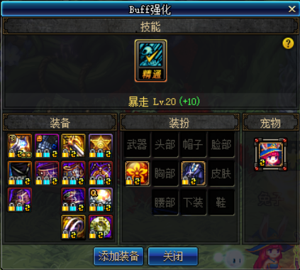 暴走换装是核心换装,红眼的主要BUFF就是暴走。暴走十级精通,20级上限,那么大家看这一身换装是已经达到了完美换装,等级堆满10级,异界6以及突击腿,这样的换装技能攻击力达到了82.6%