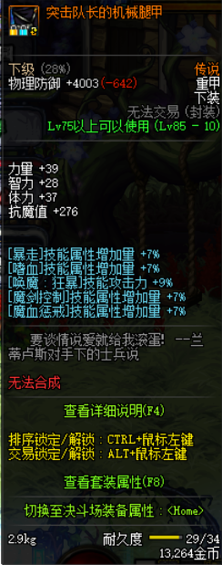 说到下装这个部位我想大家首先想到的就是突击队长的机械护腿吧,毕竟这个装备对暴走的力量有加成,也是很多堆满等级的红眼首选的护腿,但是这个装备也被商人chaos成了添加,虽然效果很好,但是大家要量力而行。