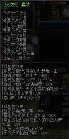 该套换装实用性大,提升非常可观,项链刀锋铁血(俗称姨妈链),每20s使自身进入出血状态20s,也可搭配战神套打击怪物触发出血的同时猴戏力量。