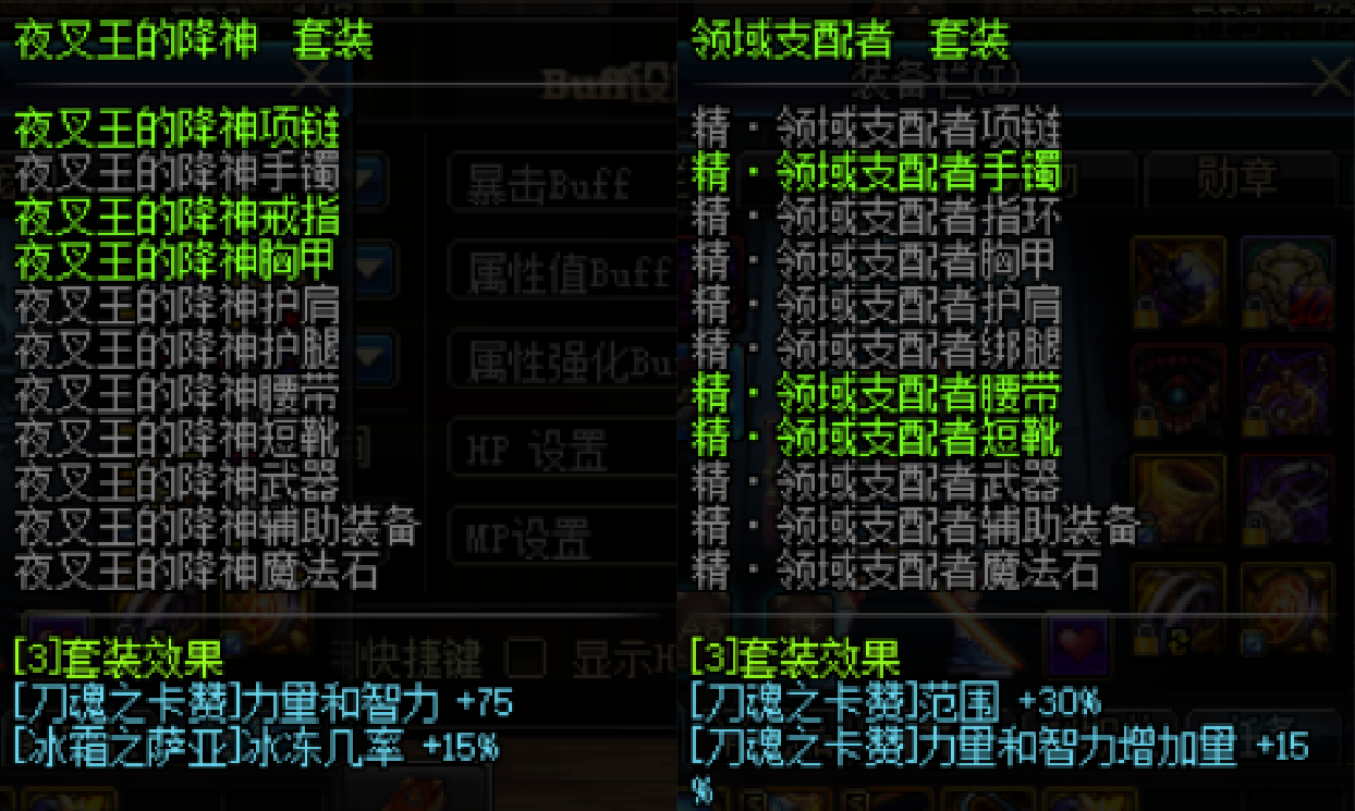 除了偷学技能,我们想要红阵更大,则需要做一套红阵换装,异界二期的领域支配者3件套提升30%范围,三期的夜叉王的降神增加75点的力量。