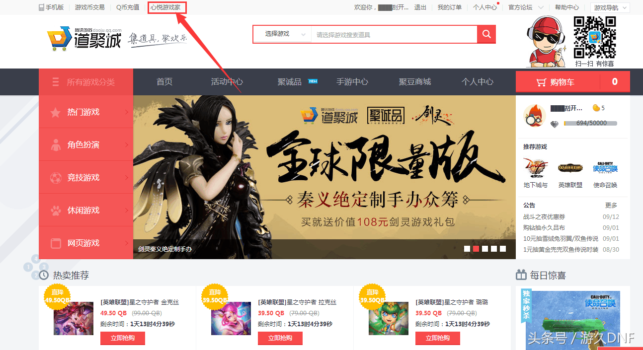 网友分享的方法之一,具体操作为去腾讯道聚城,点击心悦游戏家。