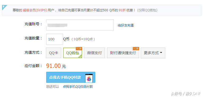 超级会员每月91折QB有500的限额(PS:好消息是这个91折的QB可以给朋友充值,也就意味着你可以忽悠几个有超级会员,但是很少充QB的好友,帮你便宜点充值)