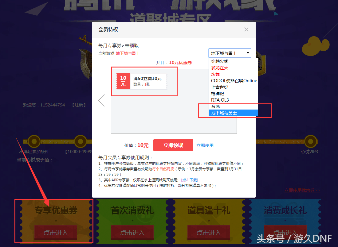 进入后点击专享优惠券,选择地下城与勇士,然后就可以看到自己可以领取的优惠券了。游戏券的额度是根据自己心悦等级来赠送的,游戏玩家LV4 50减10,心悦1 200减40,心悦2 300减60,心悦3 300减60+100减20。以此计算的话,如果购买一套国庆套,使用300减60的游戏券加上QQ超级会员充值QB 9.1折,国庆套的价格为: