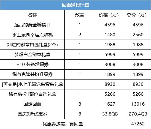 8套回血总计:47262/68=695元①花费(按照1张7折/6张9折计算)用代币券买:278*0.7+278*0.9*6+278=194.6+1,501.2+278=1,973.8元代币券打折后花费:1,973.8*0.875=1727元 实际花费:1727-695=1032元(买金秋礼包,1套多计入回血33.8QB)