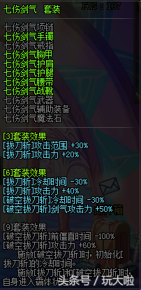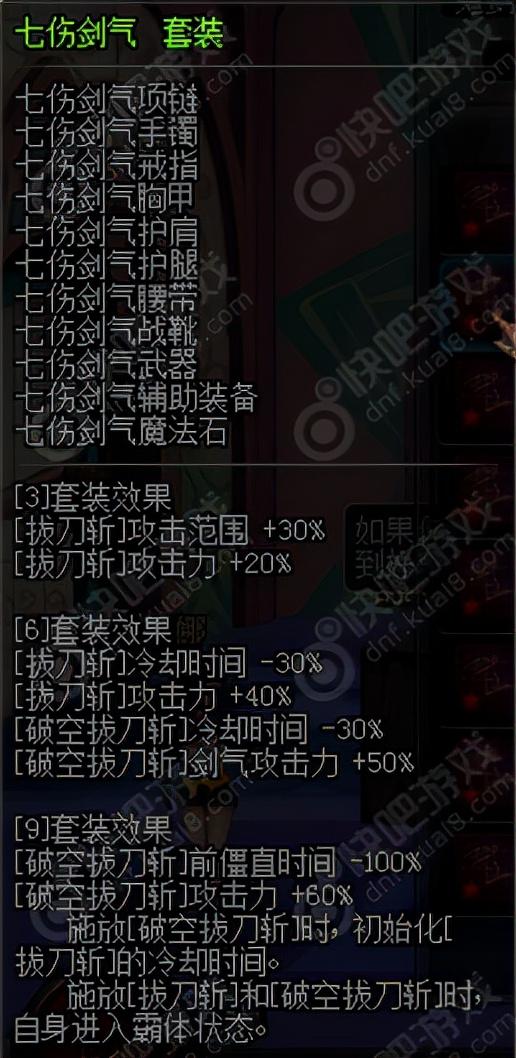 七伤剑气套装是剑魂的异界套,主要针对拔刀斩技能进行加成。在9件套的效果下,增加30%的攻击范围以及60%的技能攻击力,以及减少30%的技能冷却时间。同时破空拔刀斩也有加成,对于剑魂来说是一套非常适合搬砖的装备。其中还有个最重要的因素是施放拔刀斩或者破空拔刀斩时的霸体状态,妈妈再也不担心我会被打断技能了。