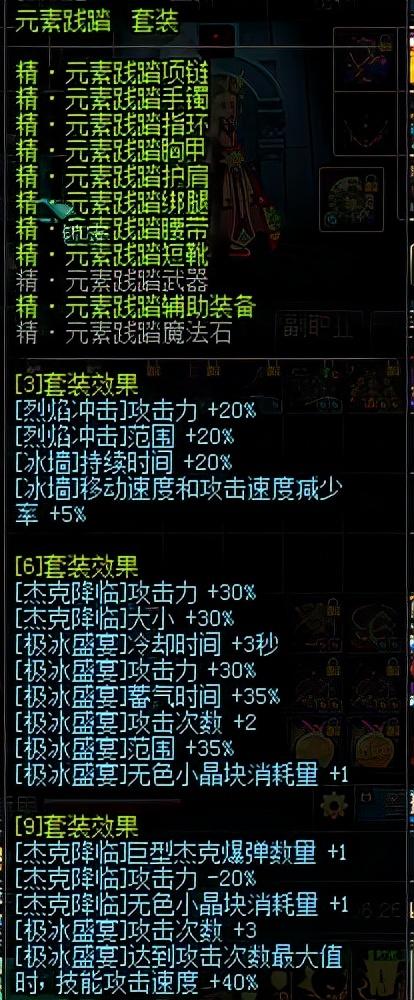 元素的异界套都很有特色而且都不弱,我印象中这一套用的人是最多的。践踏套对冰火伤害极限提升,高伤害的火系,完美清图的极冰,保护能力超强的冰墙。践踏9下,吃CD药11S一发4W百分比的南瓜,践踏对极冰范围和伤害提升也是最大。当时无论是搬砖还是刷高等级副本都是不错的一套。