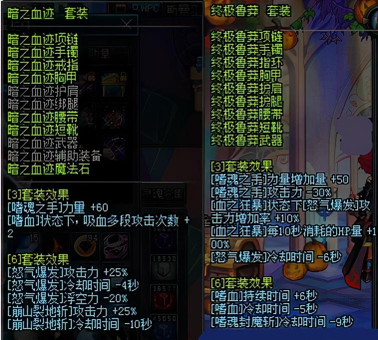 唯一一套可以和史诗套抗衡的异界套,强力加成恶魔之力,毕业武器虚无之眼十分便宜可以买到,而且配合亡者6堪比开魔能的荒古+艾格尼斯,但是亡者9件套有严重的弊端,增加能量上限,但是半魔化的能量削减是百分比削减,韩服貌似改成固定数值削减了,因为能量削减速度不变,但是能量上限增加