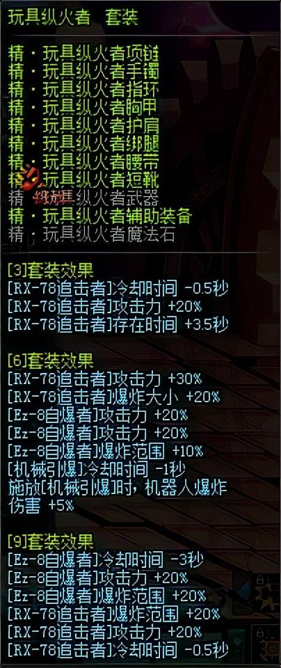 纵火9套装效果主要加成的就是男机械的R系自爆机器人技能,增加技能攻击力、爆炸范围、存在时间以及减少冷却时间。最终的小78的冷却时间在1秒左右,结合高攻击高爆炸范围,使其成为男机械最为主流的套装。